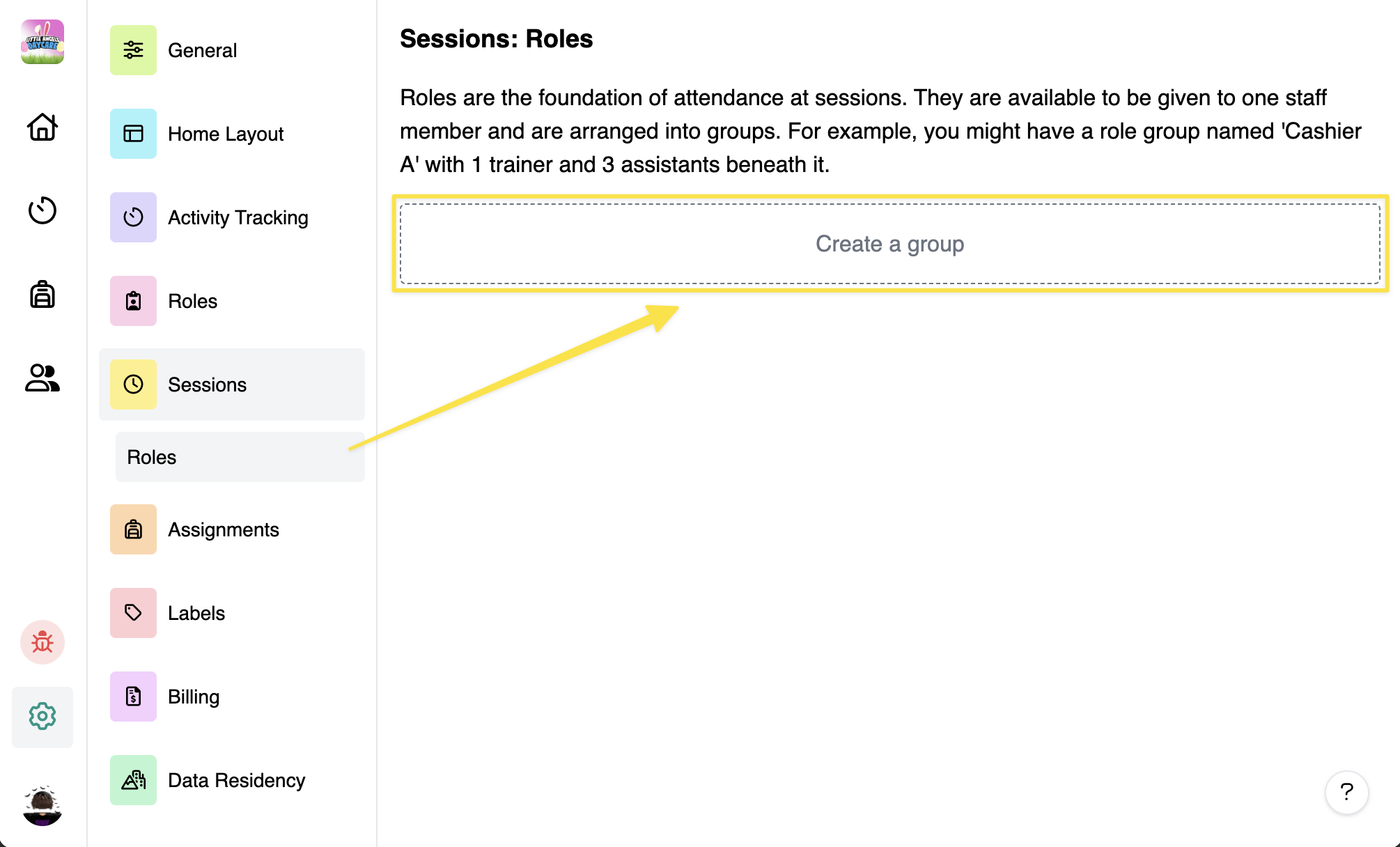 To create a Role Group, you need to go to Settings > Sessions > Roles, and click "Create a group". Once clicked, it will ask you to give it a name.