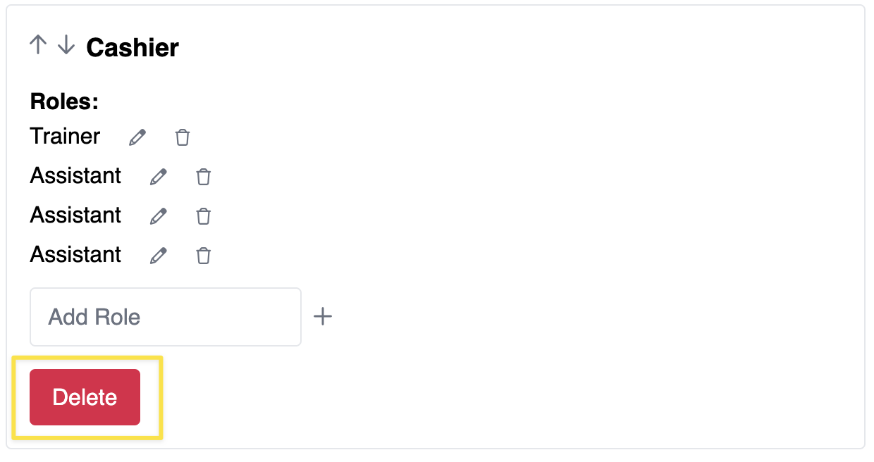 Deleting a Role Group is pretty simple, just hit Delete in the role group and confirm. If you accidentally created another role in a Role Group, you can simply click the trash icon beside the role.